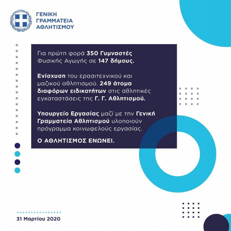 Οι 350 θέσεις εξ αυτών, στηρίζοντας εμπράκτως και για πρώτη φορά τόσο εμφατικά τους γυμναστές, θα αφορούν σε αποφοίτους Φυσικής Αγωγής για 147 Δήμους σε όλη την Ελλάδα. Γυμναστές, οι οποίοι θα ενισχύσουν τον ερασιτεχνικό, μαζικό, αθλητισμό.