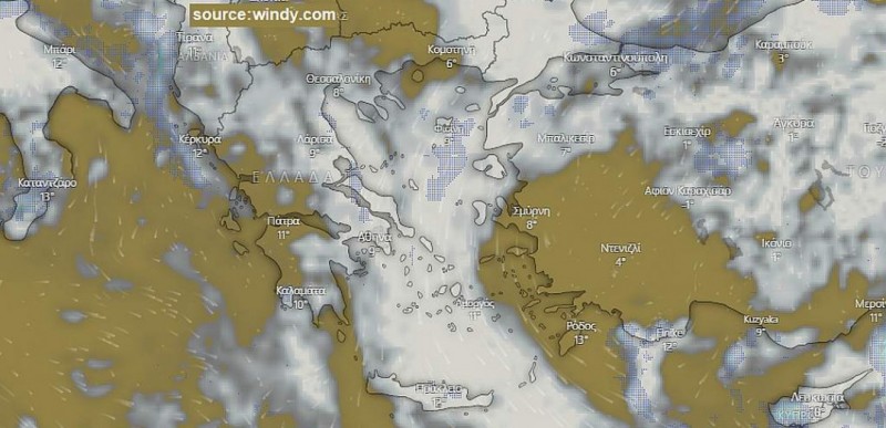 Άνεμοι, στο Ιόνιο μεταβλητοί 3-4, στο Αιγαίο Βοριάδες 4-6 Μποφόρ. Θερμοκρασίες, στη βόρεια και κεντρική Ελλάδα από -4 έως 11, στη δυτική και νότια από 2 έως 14 και στις νησιωτικές περιοχές από 6 έως 14 βαθμούς.