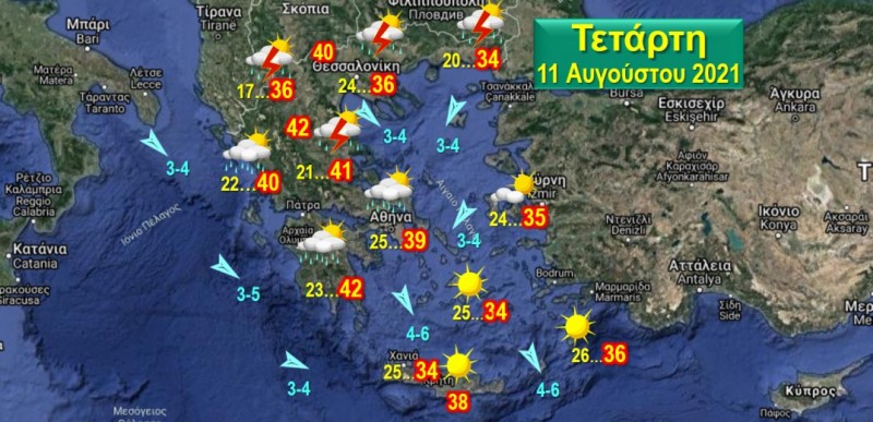 Άνεμοι, Βοριάδες, στο Ιόνιο, στο βόρειο και κεντρικό Αιγαίο 3-5 Μποφόρ, στο νότιο Αιγαίο 4-6 Μποφόρ. Θερμοκρασία, στα βόρεια ηπειρωτικά από 17 έως 40, στα δυτικά, κεντρικά και νότια ηπειρωτικά και το Ιόνιο από 23 έως 42, στα νησιά του βόρειου και ανατολικού Αιγαίου και τα Δωδεκάνησα από 24 έως 36, στις Κυκλάδες και την Κρήτη από 25 έως 34 στη νότια Κρήτη έως 38 βαθμούς.