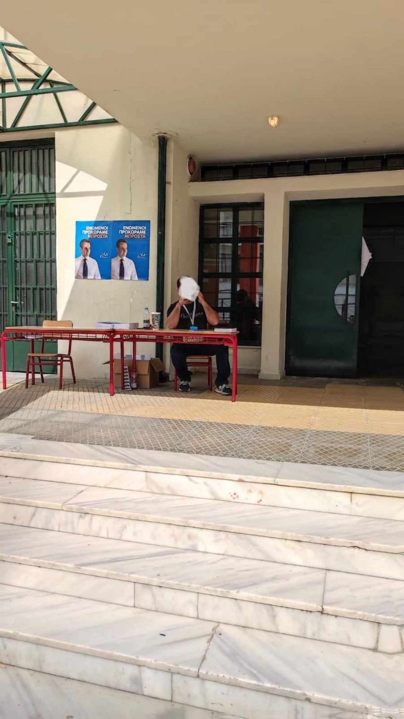 Οι εκλογικοί εκπρόσωποι της ΝΔ αναρτούσαν αφίσες και διένειμαν εκλογικό υλικό του κόμματός τους μέσα στα εκλογικά τμήματα.