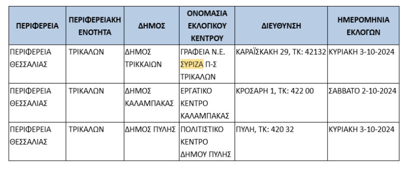 Καλούμε τα μέλη και τους φίλους του ΣΥΡΙΖΑ-ΠΣ Τρικάλων, να συμμετέχουν στις εκλογές για την ανάδειξη αντιπροσώπων για το έκτακτο συνέδριο. Τα εκλογικά κέντρα στα οποία θα διεξαχθούν οι εκλογές το Σάββατο 2 και την Κυριακή 3 Νοεμβρίου, ανά Οργάνωση Μελών, είναι τα παρακάτω