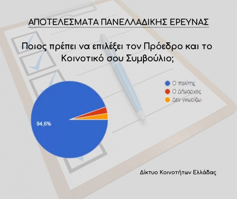 Η συντριπτική πλειοψηφία (94,6%) πιστεύει ότι ο πολίτης είναι αυτός που πρέπει να διαλέγει τον Κοινοτικό Σύμβουλο και όχι ο Δήμαρχος.