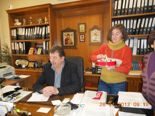 Οι εργαζόμενοι στο Δημαρχείο δεν θα μπορούσαν να το αφήσουν έτσι το θέμα. Με το που μπήκε στο γραφείο του ο Δήμαρχος, εργαζόμενοι και Αντιδήμαρχοι μπήκαν με μια τούρτα κάνοντας την έκπληξη στον κ. Σακελλαρίου ευχόμενοι και τραγουδόντας ” Να ζήσεις Δημήτρη και χρόνια πολλά…”!!!