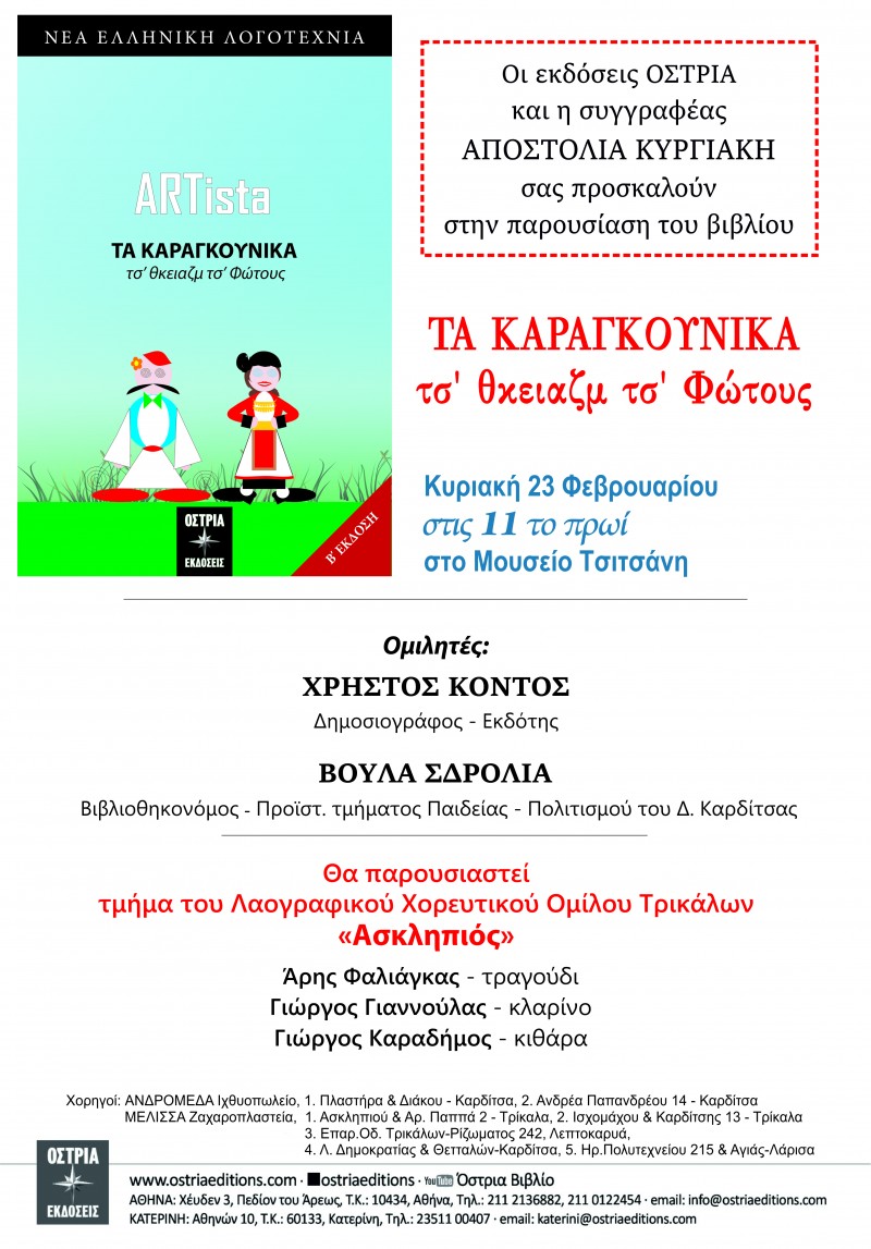 Το βιβλίο που μέσα σε τέσσερις μήνες από την κυκλοφορία του, έφτασε στη Γ’ Έκδοση κι έχει διαβαστεί όχι μόνο στη Θεσσαλία, σε όλη την Ελλάδα, στην Κύπρο αλλά και σε Γερμανία, Σουηδία, Αγγλία, Ντουμπάι, της καρδιτσιώτισσας συγγραφέως Αποστολίας Κυργιάκη, παρουσιάζεται στα Τρίκαλα.