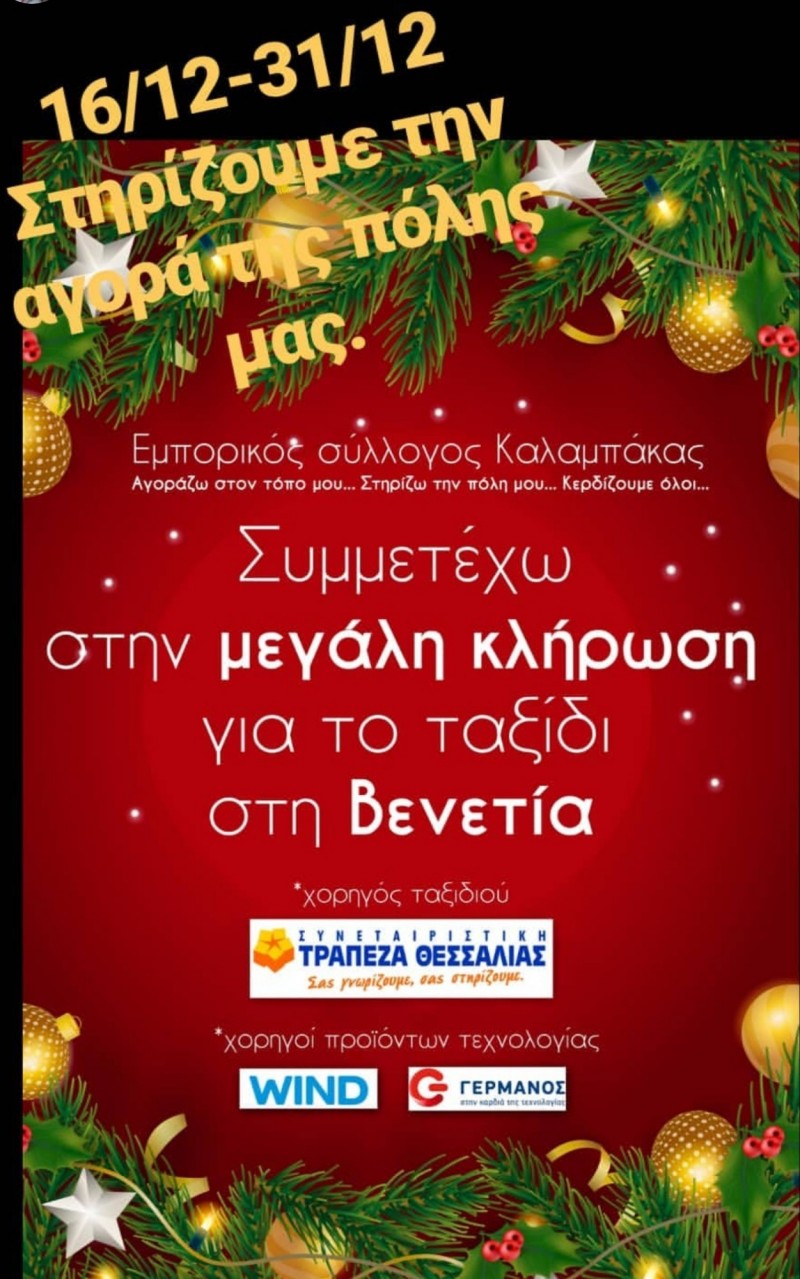 Ταξίδι στην Βενετία είναι το μεγάλο δώρο του Εμπορικού Συλλόγου Καλαμπάκας που θα κερδίσει κάποιος καταναλωτής που θα κανει τις αγορές του από τις 16 έως τις 31 Δεκεμβρίου από τα Εμπορικά καταστήματα της Καλαμπάκας και λάβει μέρος στην μεγάλη κλήρωση!