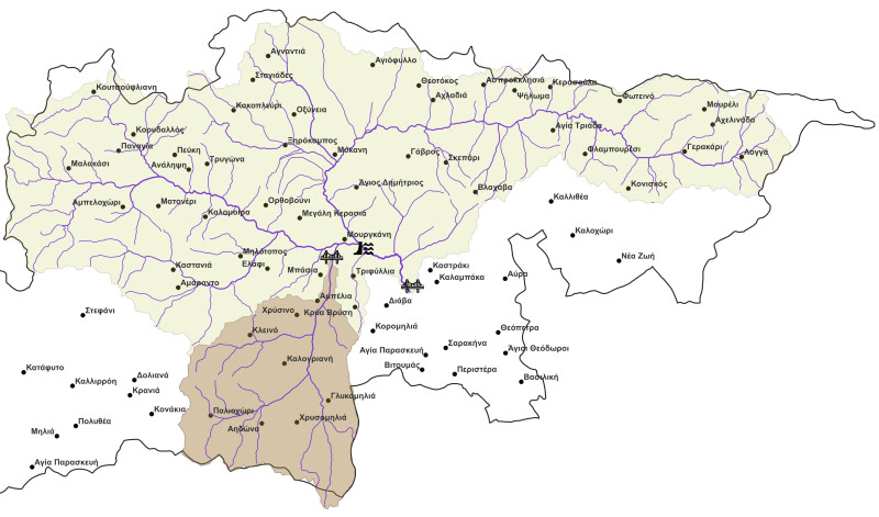 Εικόνα 1. Η απεικόνιση, της «λεκάνης απορροής» (επιφάνεια με «ανοιχτή πράσινη» απόχρωση) (του «”Πηνειού Ποταμού”, που αντιστοιχεί έως την θέση στην «Γέφυρα Διάβας», η οποία βρίσκεται περίπου στην θέση ανάμεσα στον οικισμό «Διάβα» και στην πόλη «Καλαμπάκα»), η απεικόνιση, της «λεκάνης απορροής» (επιφάνεια με «ανοιχτή καφέ» απόχρωση) (του «”Πηνειού Ποταμού” και συγκεκριμένα του «Κλεινοβίτικου Ρέματος», που αντιστοιχεί έως την θέση στην «Γέφυρα Αμπελίων», η οποία βρίσκεται περίπου στην θέση μεταξύ των οικισμών «Αμπέλια», «Μπάσια» και «Μουργκάνη»), των «υδρογραφικών (γραμμικών) δικτύων» (γραμμές με «έντονη μπλε» απόχρωση με διαβάθμιση του πάχους της γραμμής, όπου το πάχος της κάθε γραμμής εξαρτάται από την “τάξη” του εκάστοτε ρέματος που αντιπροσωπεύει δηλαδή όσο μεγαλύτερη είναι η “τάξη” του ρέματος τόσο παχύτερη είναι και η αντίστοιχη γραμμή που το αντιπροσωπεύει), των «οικισμών του Δήμου Μετεώρων» (κουκίδες με «μαύρη» απόχρωση και ονομασία, επίσης, με «μαύρη» απόχρωση), του «περιγράμματος του “Δήμου Μετεώρων”» (γραμμή με «μαύρη» απόχρωση) και η προτεινόμενη θέση ενός «νέου φράγματος, (σχετικό εικονίδιο)», «του οποίου η ενδεχόμενη κατασκευή θα μείωνε την υδραυλική πίεση» στην «Γέφυρα Διάβας» κατά περίπου «95%» όπως απεικονίζονται στο «ελεύθερο διαδικτυακά λογισμικό» «Q.G.I.S.» [4], μέσω των σχετικών αρχείων που ανακτήθηκαν τόσο από την σχετική διαδικτυακή «πλατφόρμα» («Copernicus») όσο και από την σχετική διαδικτυακή «πλατφόρμα» («ΕΛ.ΣΤΑΤ.»),[1,2,4].