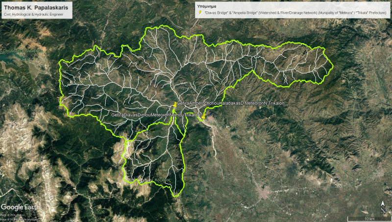 Εικόνα 3. Η απεικόνιση 1).της λεκάνης απορροής, [μεγάλη επιφάνεια με περίγραμμα με «ανοιχτή πράσινη» απόχρωση, που αντιστοιχεί έως την θέση όπου έχει κατασκευαστεί η «Γέφυρα Διάβας”», (“Δήμου Μετεώρων”), Νομού Τρικάλων”»] και του (πλήρως ανεπτυγμένου) αντίστοιχου, περιεχόμενου σε αυτήν, υδρογραφικού δικτύου (γραμμές με «άσπρη» απόχρωση), του «Πηνειού Ποταμού» και 2). της λεκάνης απορροής, [μικρή επιφάνεια με περίγραμμα με, επίσης, «ανοιχτή πράσινη» απόχρωση, που αντιστοιχεί έως την θέση όπου έχει κατασκευαστεί η «Γέφυρα Αμπελίων”», (“Δήμου Μετεώρων”), Νομού Τρικάλων”»] και του (πλήρως ανεπτυγμένου) αντίστοιχου, περιεχόμενου σε αυτήν, υδρογραφικού δικτύου (γραμμές με «άσπρη» απόχρωση), του «Ποταμού Πηνειού» (και συγκεκριμένα του «Κλεινοβίτικου Ρέματος», το οποίο αποτελεί παραπόταμο του «Πηνειού Ποταμού»), επί του υπόβαθρου της διαδικτυακής πλατφόρμας «Google Earth» [1,2,4,10].