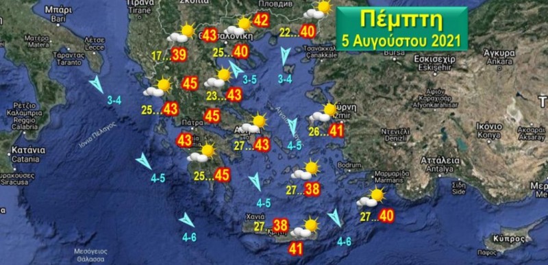 Πέμπτη 5-8-2021 – Αίθριος καιρός, με πολύ ισχυρό καύσωνα και μέγιστες θερμοκρασίες στα βόρεια ηπειρωτικά στους 41-42, στα κεντρικά και νότια τους 43-45 και στις παραθαλάσσιες και νησιωτικές περιοχές στους 40-41 βαθμούς. Το απόγευμα τοπικές βροχές ή σποραδικές καταιγίδες στην ανατολική Μακεδονία και τη Θράκη.