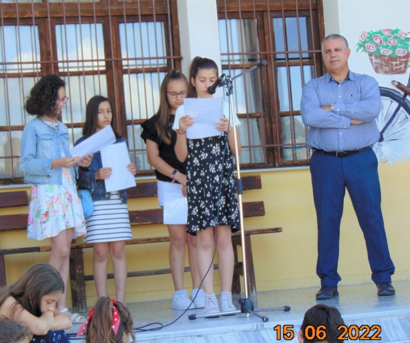 Στην όμορφη εκδήλωση αποχαιρετισμού των μαθητών της ΣΤ΄ τάξης συμμετείχαν και οι μαθητές της Ε’ τάξης του σχολείου.  Συγκινητικές οι  ομιλίες και ο χαιρετισμός από τον Διευθυντή του σχολείου κ. Χρήστο Καραγεώργο προς τους αποφοιτήσαντες μαθητές και παρευρισκόμενους γονείς, καθώς και από την δασκάλα της τάξης κα Γραμμάτη Θεοδώρα.