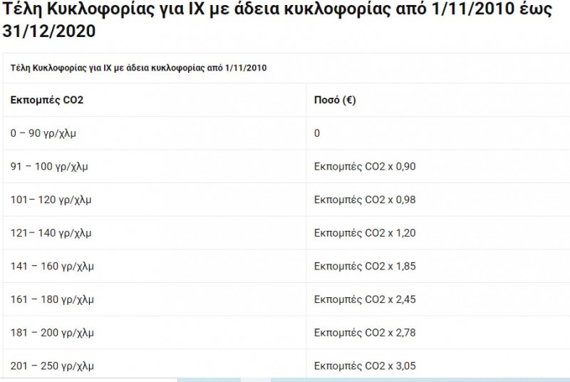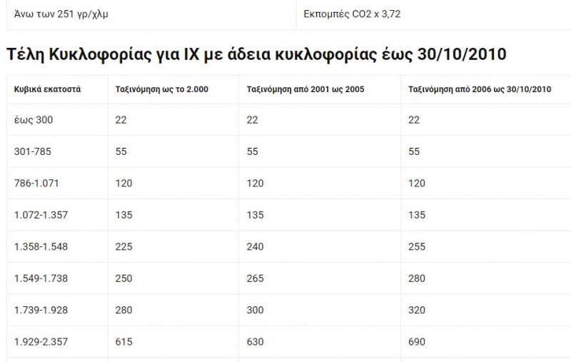 Στα παλαιότερα αυτοκίνητα, με άδεια κυκλοφορίας έως 30/10/2010, τα τέλη κυκλοφορίας υπολογίζονται με βάση την παλαιότητα και τα κυβικά εκατοστά του κινητήρα τους και κυμαίνονται: