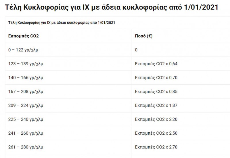 όσοι έχουν οχήματα τα οποία ταξινομήθηκαν μετά την 1 Ιανουαρίου 2021. Τα τέλη για τα οχήματα τα οποία εκπέμπουν έως 122 γραμμάρια CO2 ανά χιλιόμετρο τα οποία έχουν ταξινομηθεί μετά την 1η Ιανουαρίου 2021 θα είναι μηδενικά.