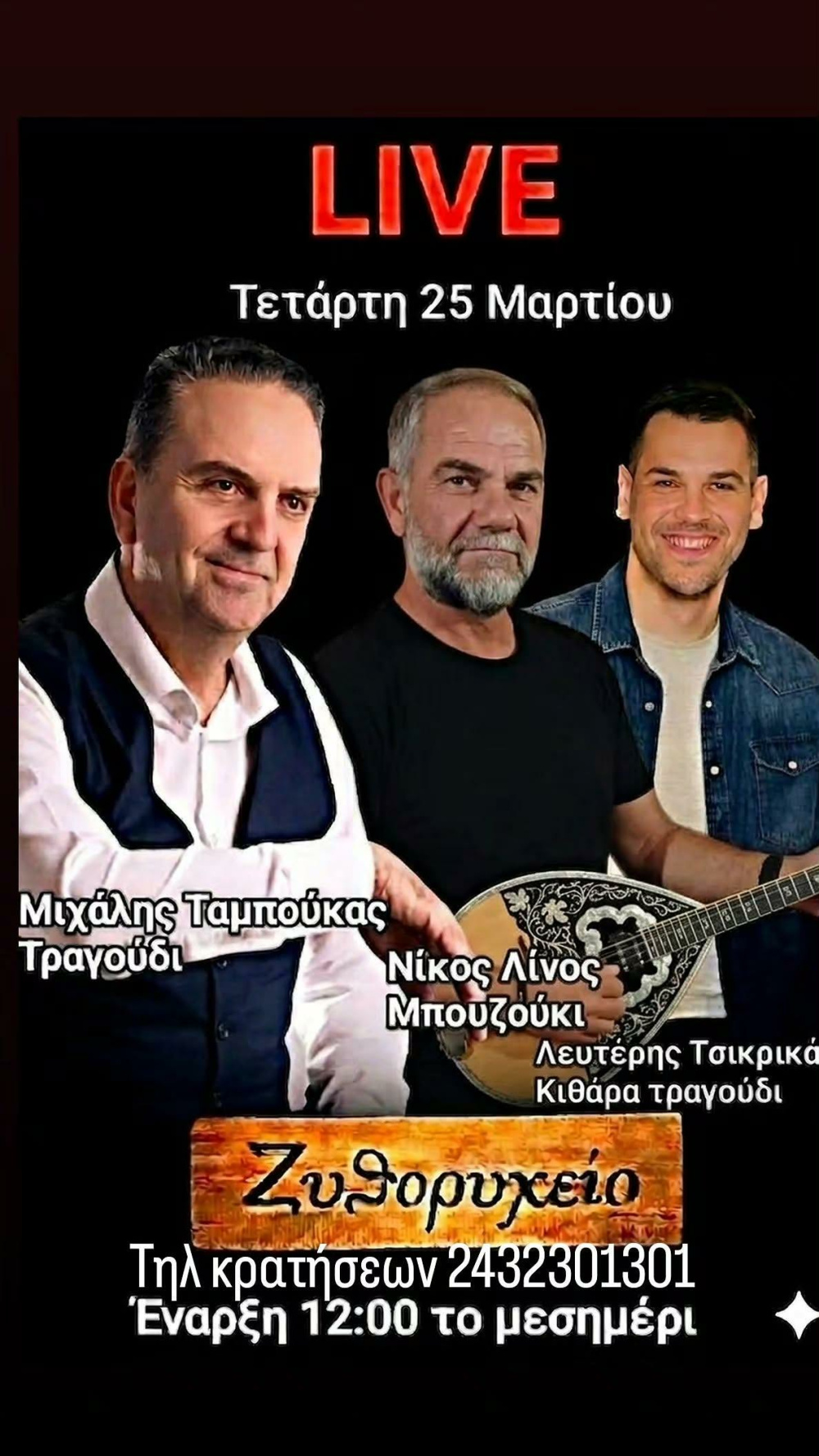Τετάρτη 25η Μαρτίου στο “Ζυθορυχείο” με Νίκο Λίνο, Μιχάλη Ταμπούκα και Λευτέρη Τσικρικά