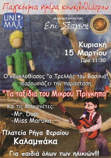 Το Θεατρικό Εργαστήρι “Επί Σταγών” και το τμήμα κουκλοθεάτρου με την υπεύθυνη Αναστασία Καραφύλλα γιορτάζει τη ξεχωριστή αυτή μέρα με την UNIMA HELLAS στην Πλατεία Ρήγα Φεραίου την Κυριακή το πρωί 15 Μαρτίου και ώρα 11:30.