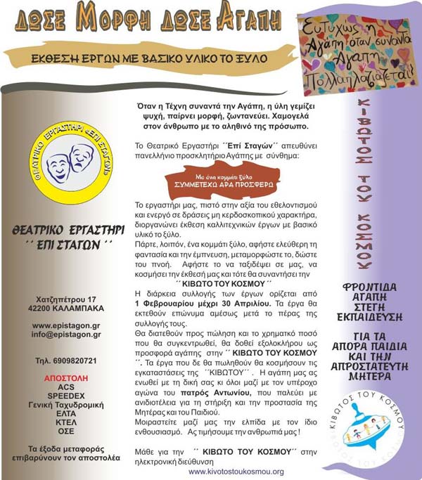 Μας εστάλη από το Θεατρικό Εργαστήρι “Επί Σταγών” το φυλλάδιο το οποίο ενημερώνει για την έκθεση καλλιτεχνικών έργων με βασικό υλικό το ξύλο, που πραγματοποιεί για την οικονομική ενίσχυση της “Κιβωτού του κόσμου”