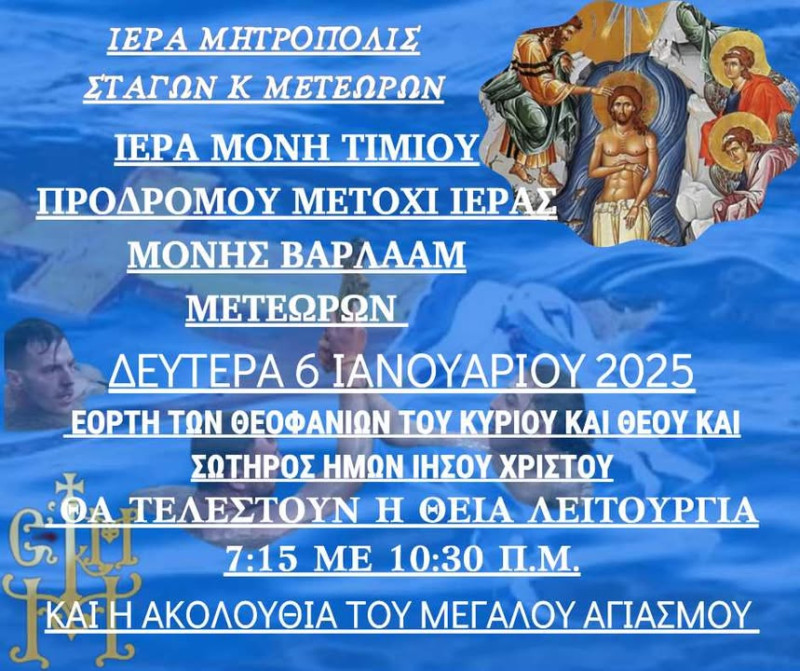 Τη Δευτέρα 6 Ιανουαρίου 2025 εορτή των Θεοφανίων του κυρίου ημών Ιησού Χριστού θα τελεστούν η θεία λειτουργία 7: 15 με 10:30 π.μ. και η ακολουθία του μεγάλου αγιασμού.