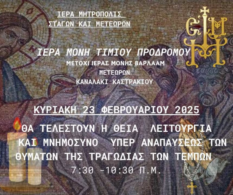 Την Κυριακή 23 Φεβρουαρίου από 07:30 έως 10:30 π.μ στην Ιερά Μονή Τιμίου Προδρόμου μετόχι της Ι.Μ Βαρλαάμ Μετεώρων στο Καναλάκι Καστρακίου, θα τελεστεί Θεία Λειτουργία και μνημόσυνο υπερ αναπαύσεως των θυμάτων της τραγωδίας των Τεμπών.