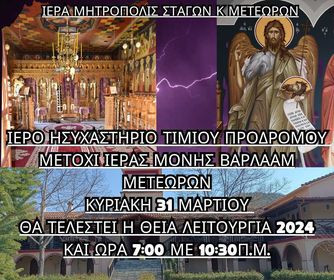 Θεία Λειτουργία στο Ιερό Ησυχαστήριο του Τιμίου Προδρόμου Μετόχι της Ιεράς Μονής Βαρλαάμ Μετεώρων Ανακοινώσεις Από admin Δημοσίευση Μαρ 30, 2024 -11:53 0 775 Κοινοποίηση FacebookTwitterΗλεκτρονικό ΤαχυδρομείοViber Το Ιερό Ησυχαστήριο του Τιμίου Προδρόμου Μετόχι της Ιεράς Μονής Βαρλαάμ Μετεώρων ενημερώνει τους ευσεβείς προσκυνητές ότι την Κυριακή 31 Μαρτίου 2024 θα τελεστεί η Θεία λειτουργία και ώρα 7:00 π.μ. με 10:30 π.μ. 0 775 Κοινοποίηση