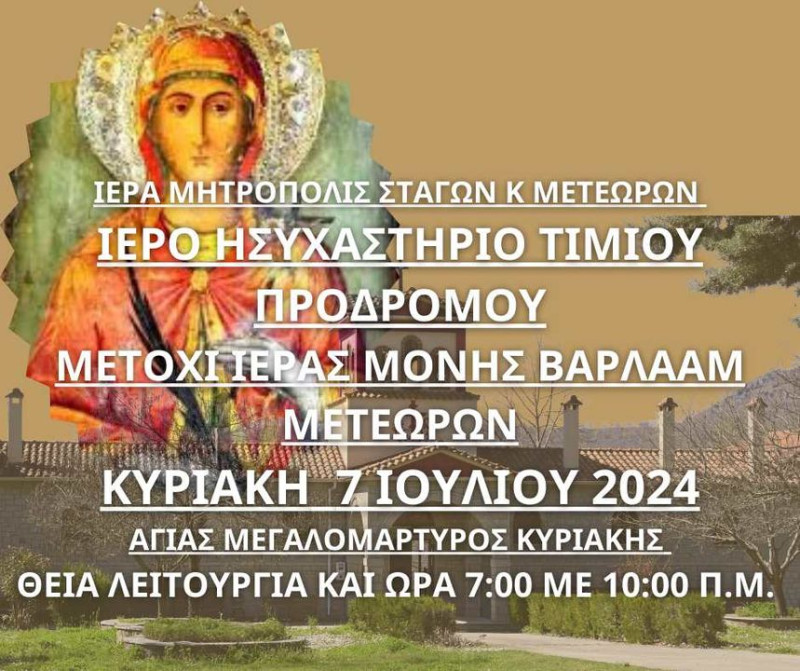 Το Ιερό Ησυχαστήριο του Τιμίου Προδρόμου Μετόχι της Ιεράς Μονής Βαρλαάμ Μετεώρων ενημερώνει τους ευσεβείς προσκυνητές ότι την Κυριακή 7 Ιουλίου Αγίας Μεγαλομάρτυρος Κυριακής θα τελεστεί Θεία λειτουργία από τις 7:00 έως τις 10:00 π.μ.