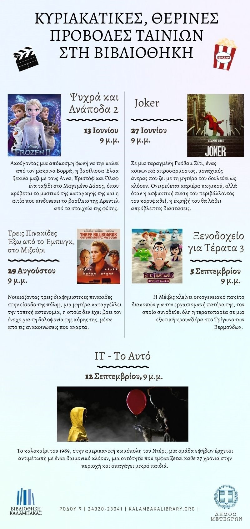 Νέες κινηματογραφικές εμπειρίες θα ζήσουν και αυτό το καλοκαίρι οι φίλοι του θερινού σινεμά. Για ακόμη μια χρονιά η Βιβλιοθήκη Καλαμπάκας σε συνεργασία με το Δήμο Μετεώρων διοργανώνουν θερινές προβολές ταινιών στον αύλειο χώρο της Βιβλιοθήκης για μικρούς και μεγάλους!