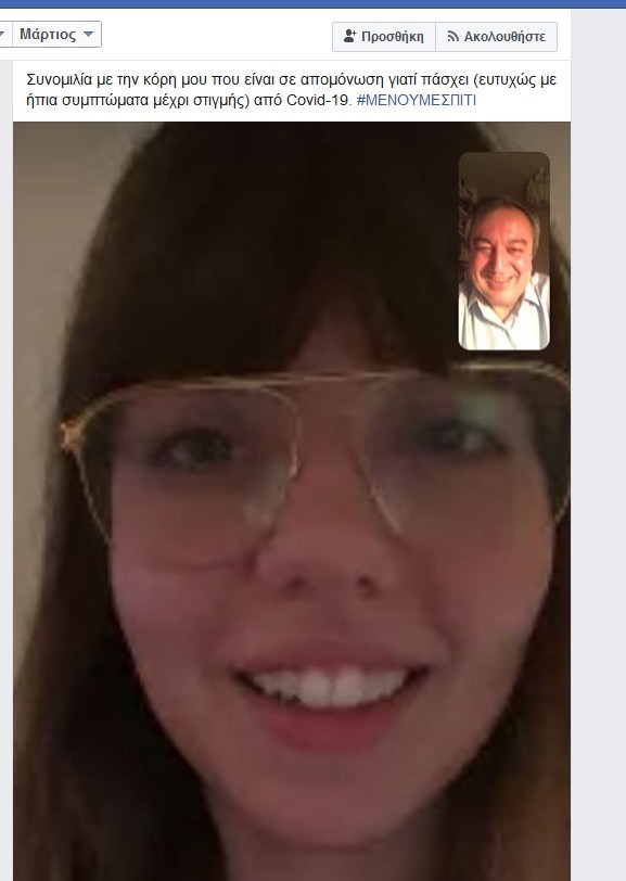 Θετική στον κορονοϊό έχει διαγνωστεί η κόρη του Ηλία Μόσιαλου, όπως αποκάλυψε ο ίδιος σε ανάρτησή του στο Facebook. Στην ανάρτησή του στο Facebook o καθηγητής Πολιτικής της Υγείας στο London School of Economics, Ηλίας Μόσιαλος αποκάλυψε πως η κόρη του προσεβλήθη από τον ιό και δημοσίευσε μια φωτογραφία, στην οποία φαίνεται να μιλά μέσω skype μαζί της.
