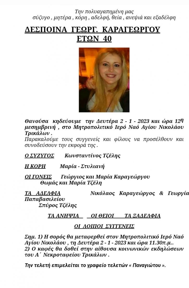 Την πολυαγαπημένη μας σύζυγο , μητέρα , κόρη , αδελφή, θεία , ανεψιά και εξαδέλφη ΔΕΣΠΟΙΝΑ ΓΕΩΡΓ. ΚΑΡΑΓΕΩΡΓΟΥ ΕΤΩΝ 40 Θανούσα κηδεύουμε την Δευτέρα 2 – 1 – 2023 και ώρα 12η μεσημβρινή , στο Μητροπολιτικό Ιερό Ναό Αγίου Νικολάου Τρικάλων .