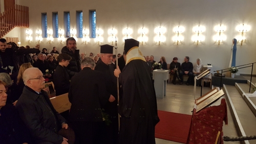 Περισσότερα από 500 άτομα παρακολούθησαν με συγκίνηση την εξόδιο ακολουθία, της οποίας προεξήρχε ο Σεβ. Μητροπολίτης Σουηδίας και πάσης Σκανδιναυΐας κ. Κλεόπας, ο οποίος επισκέφθηκε τον μακαριστό Ιωάννη στο νοσοκομείο όπου νοσηλευόταν, κατά την πρόσφατη ποιμαντορική του περιοδεία στην περιοχή το τριήμερο 28-30 Οκτωβρίου, με την ευκαιρία της πανηγύρεως της ενορίας του Αποστόλου Κλεόπα.