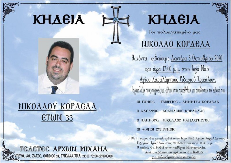 Τη Δευτέρα η κηδεία του 33χρονου Νικόλαου Κορδέλα Ανακοινώσεις Από admin Δημοσίευση Οκτ 3, 2020 -13:05 0 2.147 Κοινοποίηση FacebookTwitterΗλεκτρονικό ΤαχυδρομείοViber Τον πολυαγαπημένο μας Νικόλαο Κορδέλα ετών 33 θανόντα κηδεύουμε τη Δευτέρα 5 Δευτέρα και ώρα 17:00 το απόγευμα στον Ιερό Ναό Αγίου Χαραλάμπους Ριζαριού Τρικάλων. 0 2.147 Κοινοποίηση