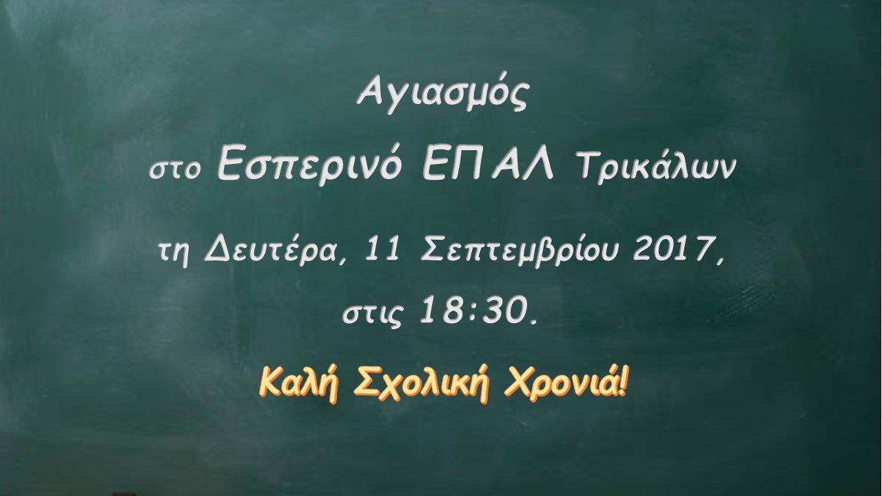Σας προσκαλούμε στο ξεκίνημα της νέας σχολικής χρονιάς που θα γίνει με την καθιερωμένη τελετή  του Αγιασμού στο Εσπερινό Επαγγελματικό Λύκειο Τρικάλων τη Δευτέρα, 11 Σεπτεμβρίου 2017 και ώρα 18.30.