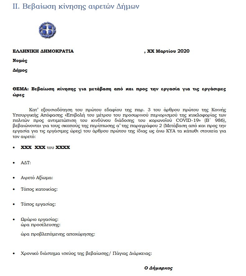 Διευκρινίσεις για τις μετακινήσεις των Αιρετών της Πρωτοβάθμιας Αυτοδιοίκησης περιλαμβάνονται, μεταξύ άλλων, στην αριθμ. 40/31.3.2020 Εγκύκλιο του Γενικού Γραμματέα Εσωτερικών & Οργάνωσης του Υπουργείου Εσωτερικών. Επιπλέον, στο Παράρτημά της περιλαμβάνεται Πρότυπο για τη “Βεβαίωση Κίνησης Αιρετών Δήμων”.