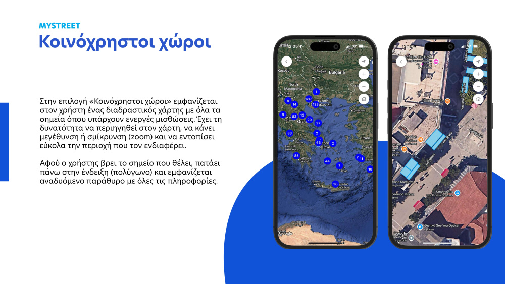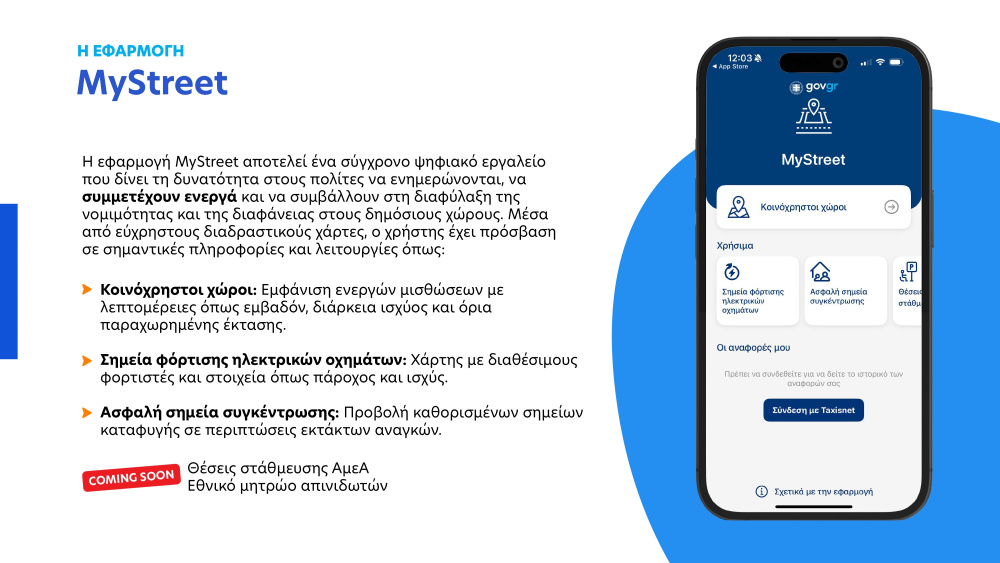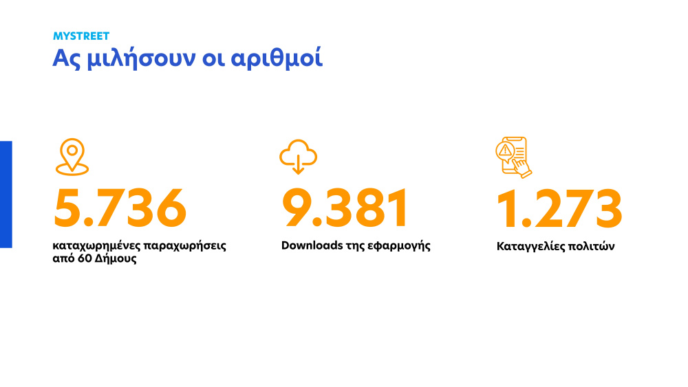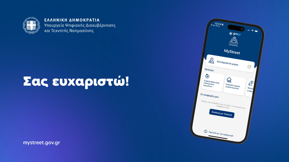 Το MyStreet μπορούν να κατεβάσουν δωρεάν οι πολίτες στα κινητά τους τηλέφωνα μέσω του App Store και του Play Store. Ήδη, 9.381 πολίτες έχουν κατεβάσει την εφαρμογή και έχουν υποβάλει 1.273 καταγγελίες, ενώ 60 Δήμοι έχουν καταχωρήσει 5.736 παραχωρήσεις στο Μητρώο Καταχώρισης Αδειών Χρήσης Κοινόχρηστων Χώρων. Σκοπός του MyStreet είναι να διασφαλίσει την πρόσβαση όλων των πολιτών ανεξαιρέτως στους κοινόχρηστους χώρους, προσφέροντας τόσο στους πολίτες την ευκαιρία να συμμετέχουν ενεργά στη βελτίωση της ποιότητας ζωής στην πόλη τους, όσο και στους Δήμους τη δυνατότητα να ελέγχουν τις μισθώσεις εύκολα και γρήγορα και να βελτιώνουν την οργάνωση και τη διαχείρισή τους. Πρόκειται για μια σημαντική εφαρμογή, η οποία αναπτύχθηκε από το Υπουργείο Ψηφιακής Διακυβέρνησης, σε συνεργασία με την Τοπική Αυτοδιοίκηση.