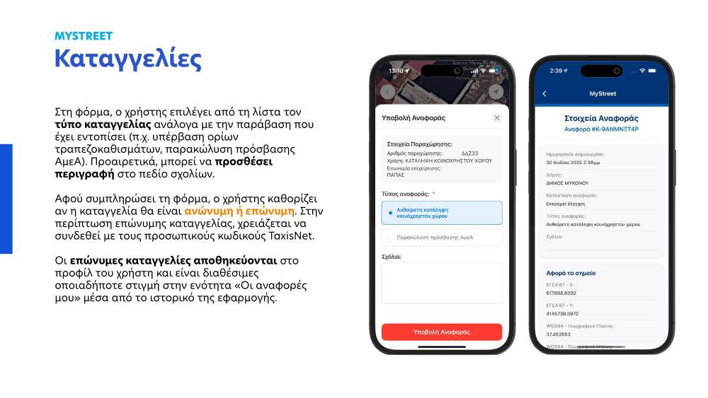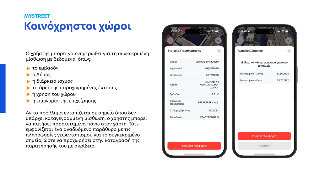 Μέσω του MyStreet οι πολίτες ενημερώνονται μέσω ενός διαδραστικού χάρτη σε πραγματικό χρόνο για τις ενεργές μισθώσεις κοινόχρηστων χώρων, όπως για παράδειγμα τραπεζοκαθίσματα καφετεριών, εστιατορίων ή άλλων επιχειρήσεων. Σε περιπτώσεις που διαπιστώνουν παραβάσεις, μπορούν να το καταγγείλουν μέσω της εφαρμογής. Με αυτόν τον τρόπο, το MyStreet συμβάλλει στην ενίσχυση της διαφάνειας, καθώς και στη συμμόρφωση και στη διατήρηση της νομιμότητας στη διαχείριση του δημόσιου χώρου.