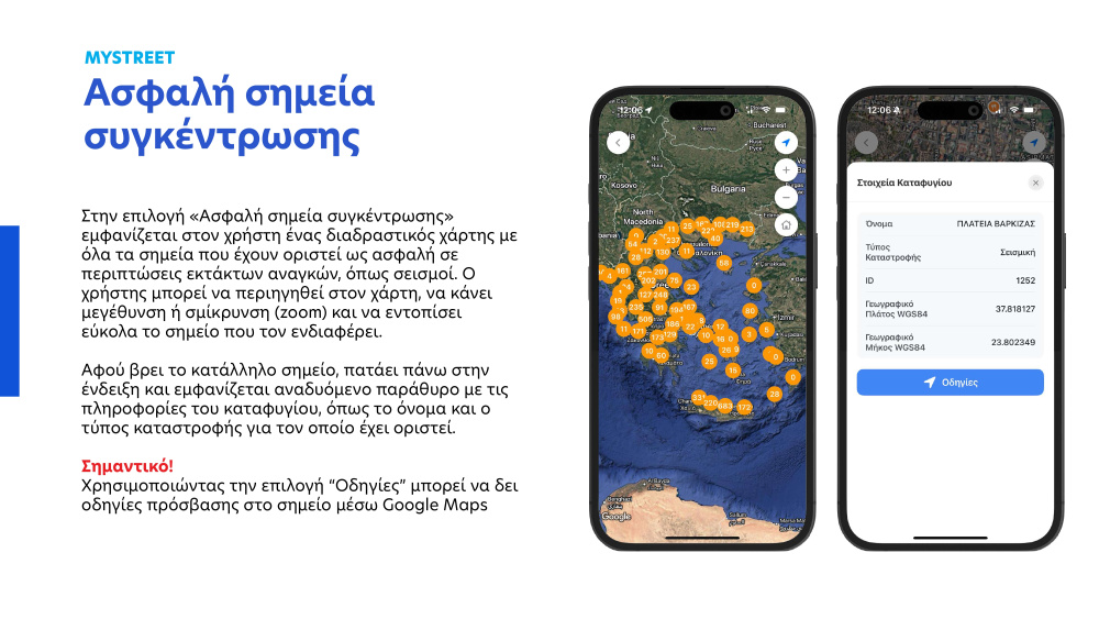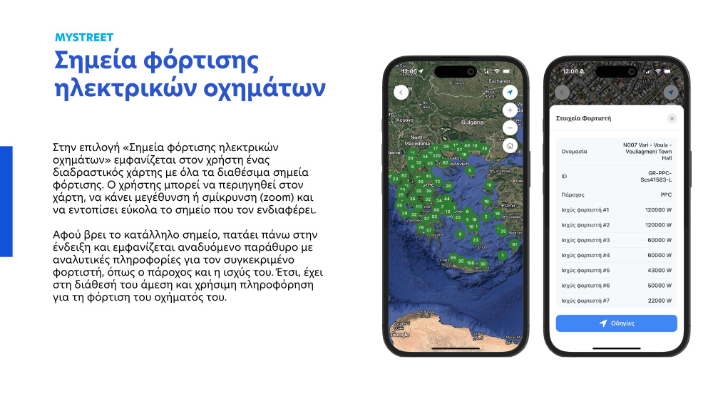 Επίσης, οι πολίτες έχουν την επιλογή να περιηγηθούν στο MyStreet σε χάρτες με τα «Σημεία φόρτισης ηλεκτρικών οχημάτων» και με τα «Ασφαλή σημεία συγκέντρωσης» σε περιπτώσεις εκτάκτων αναγκών, όπως για παράδειγμα σεισμοί. Σύντομα θα ενσωματωθούν στο MyStreet οι «Θέσεις στάθμευσης ΑμεΑ» και το «Εθνικό Μητρώο Απινιδωτών».
