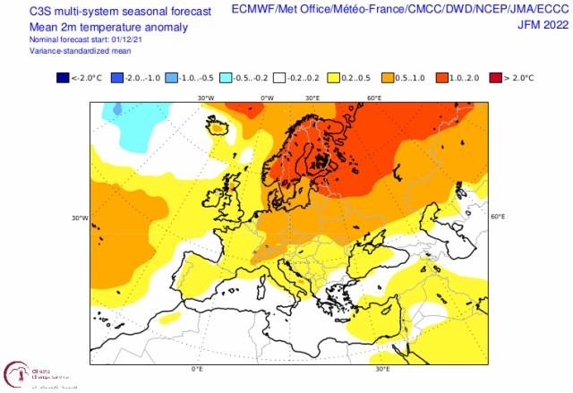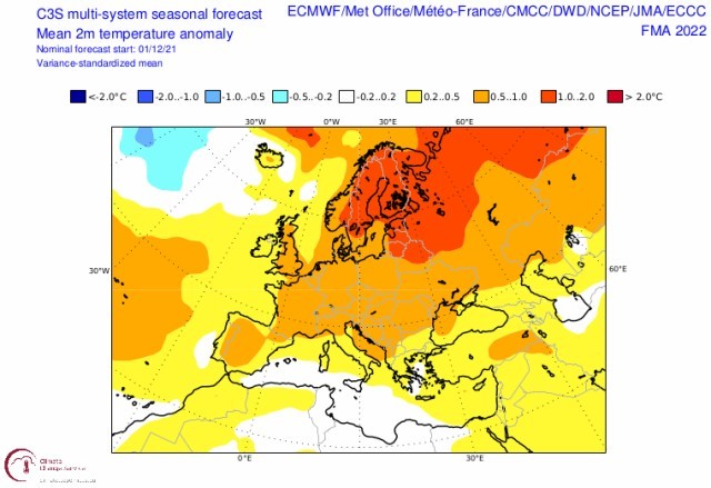 Τέλος, οι δύο τελευταίοι χάρτες απεικονίζουν την ανωμαλία της επιφανειακής θερμοκρασίας για τα δύο τρίμηνα. Το πρώτο τρίμηνο στην χώρα μας προβλέπεται οτι η θερμοκρασία θα κυμανθεί κοντά στον μέσο όρο ενώ αντίθετα στη βόρεια Ευρώπη θα είναι κατά 1 με 2 βαθμούς Κελσίου υψηλότερη. Παρόμοια προβλέπεται να κυλίσει και το δεύτερο τρίμηνο Φεβρουαρίου-Μαρτίου-Απριλίου.
