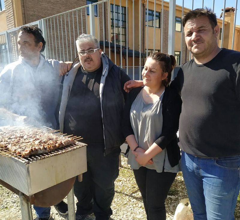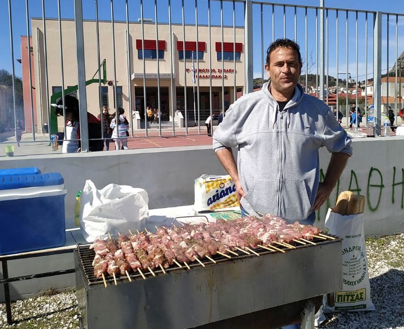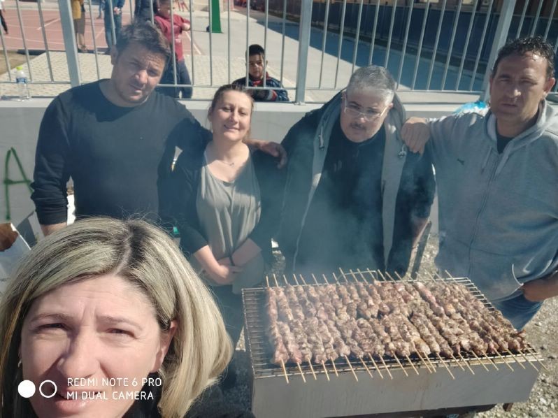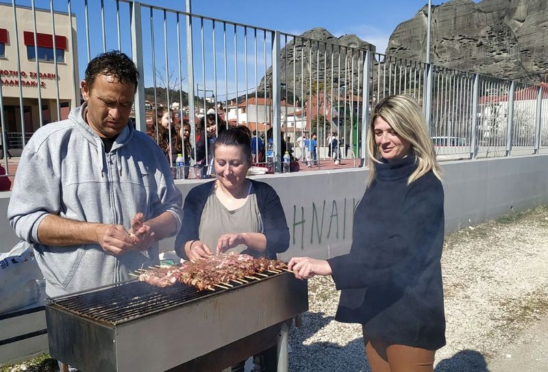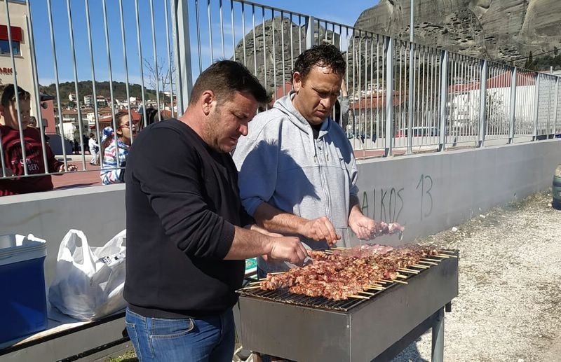Στην ψησταριά που στήθηκε απ’ έξω από τον αύλειο χώρο του Σχολείου – λόγω και της απαγόρευσης από την Α/Θμια Εκπαίδευση Τρικάλων για την διενέργεια ψησίματος εντός του σχολείου – τα μέλη του συλλόγου έψησαν σουβλάκια και λουκάνικα και τα πρόσφεραν στα παιδιά.