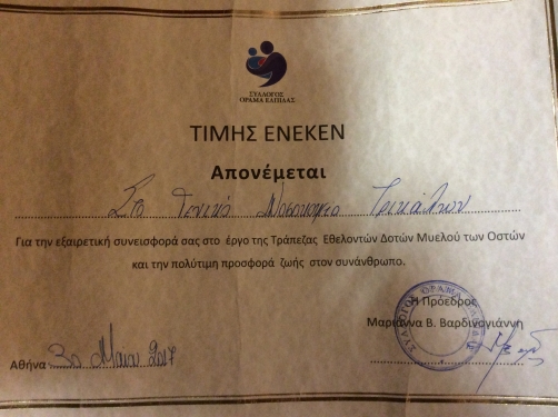 Η Πρόεδρος του Συλλόγου κα. Μαριάννα Βαρδινογιάννη μαζί με τα στελέχη του συλλόγου ευχαρίστησαν όλους όσους δουλεύουν και προσπαθούν να στηρίξουν την Τράπεζα Εθελοντών Δωρητών Μυελού των Οστών, ανέπτυξαν τους νέους στόχους και τα καινούργια σχέδια και απένειμαν τιμητικούς επαίνους μεταξύ των οποίων συμπεριλαμβάνεται και το Νοσοκομείο Τρικάλων.