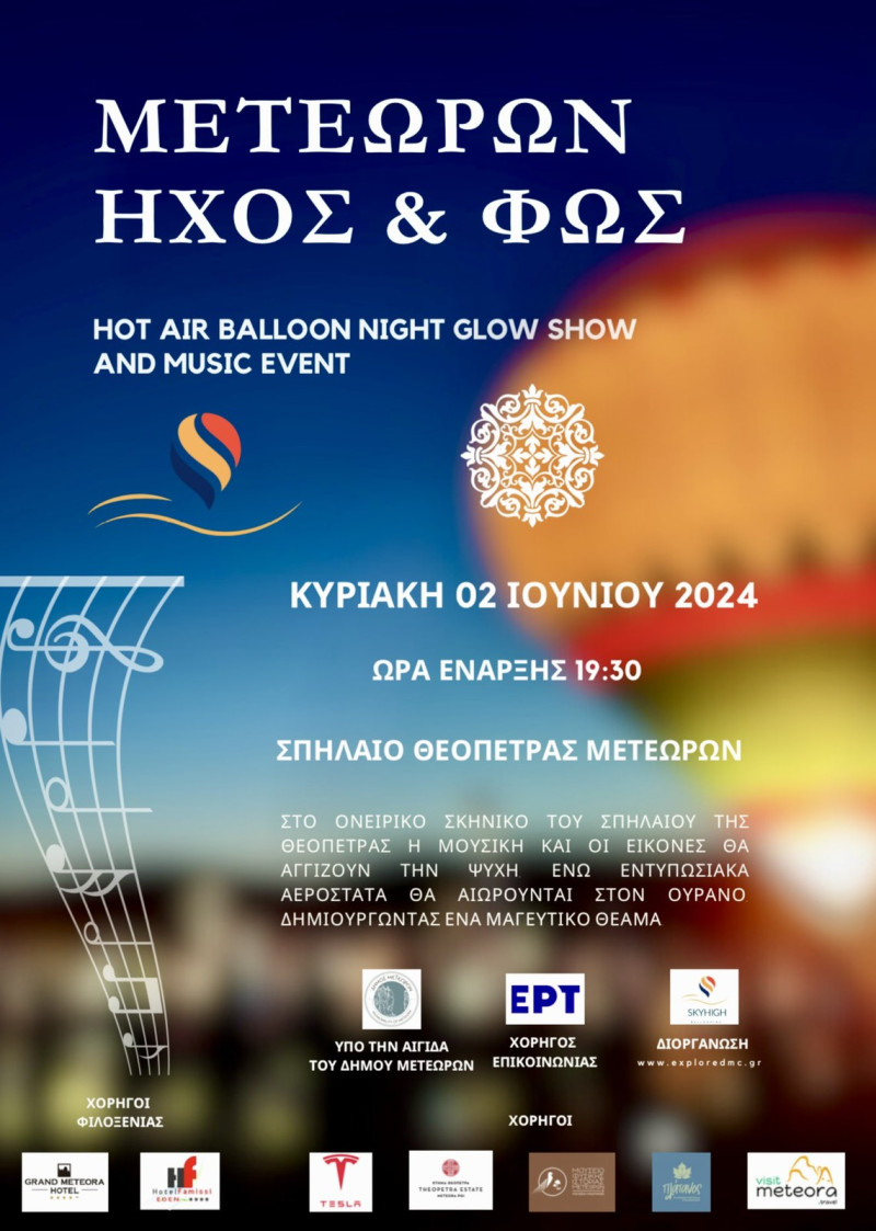 Μια μοναδική εκδήλωση που αναμένεται να μας ανεβάσει όλους στα ύψη πρόκειται να φιλοξενηθεί την Κυριακή 2 Ιουνίου στο Δήμο Μετεώρων. Πρόκειται για μια πρωτόγνωρη θεαματική εκδήλωση με αερόστατα με τίτλο «Μετεώρων Ήχος και Φως» που θα γίνει στην Θεόπετρα. Μια εκδήλωση που θα μας ταξιδέψει ανάμεσα στη γη και τον ουρανό διοργανώνεται από την Explore DMC υπό την αιγίδα του Δήμου Μετεώρων.