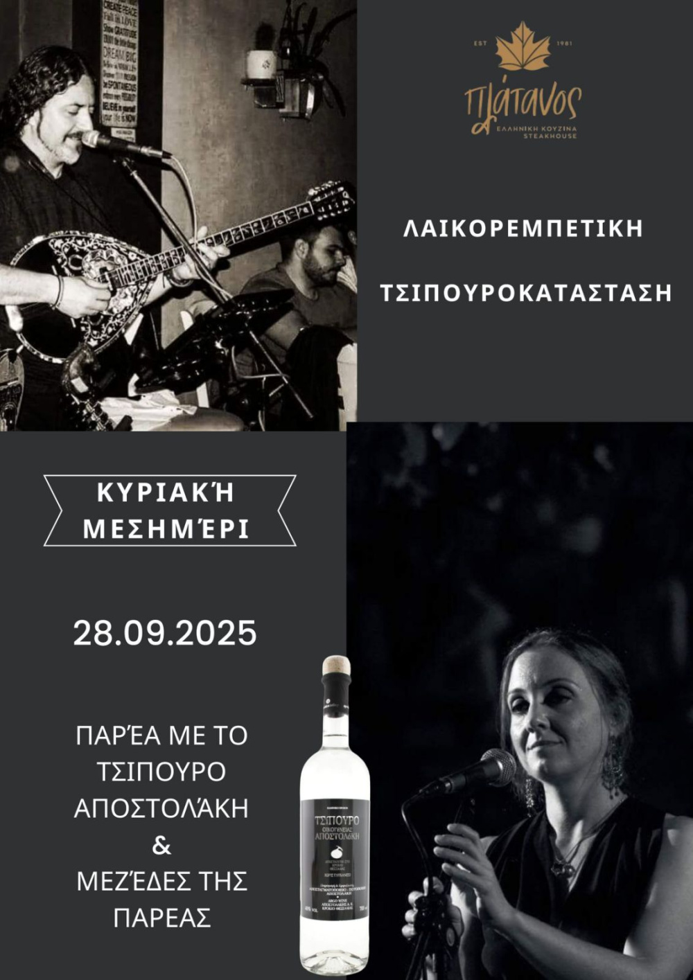 Γεμάτο με μεζέδες της παρέας που θα μας ταξιδέψουν στο παρελθόν. Λαικορεμπετικη μουσική με τον δεξιοτέχνη στο μπουζούκι Μίλτο Κρανία και στη φωνή την Μαρία Πουλιανιτη….στη παρέα μας το τσίπουρο Αποστολάκη ..