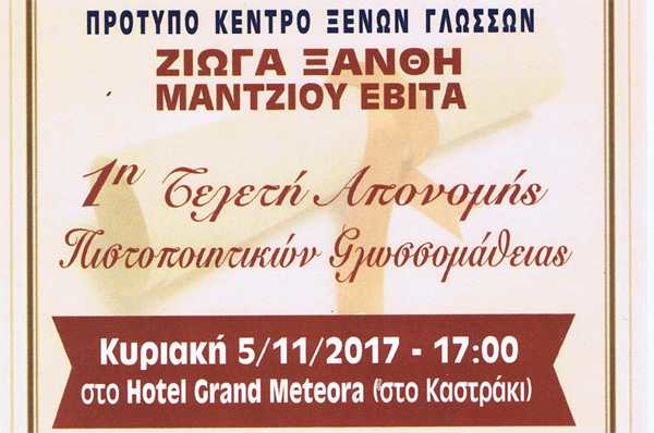 Την Κυριακή 5 Νοεμβρίου στις 17:00 στο Grant Meteora Hotel στο Καστράκι θα πραγματοποιηθεί από το Πρότυπο Κέντρο Ξένων Γλωσσών “Ζιώγα Ξανθή – Μάντζιου Εβίτα” η 1η Τελετή Απονομής Πιστοποιητικών Γλωσσομάθειας.