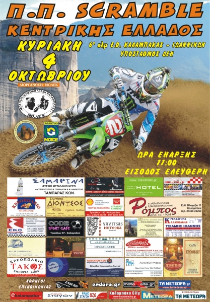 Την Κυριακή 4 Οκτωβρίου θα πραγματοποιηθεί στην ειδική πίστα, που βρίσκεται στο 6ο χλμ Καλαμπάκας – Ιωαννίνων ( Υποσταθμός ΔΕΗ ) αγώνας του Πανεληνίου Πρωταθλήματος Scramble από την Μοτοσυκλετιστική Λέσχη Καλαμπάκας.