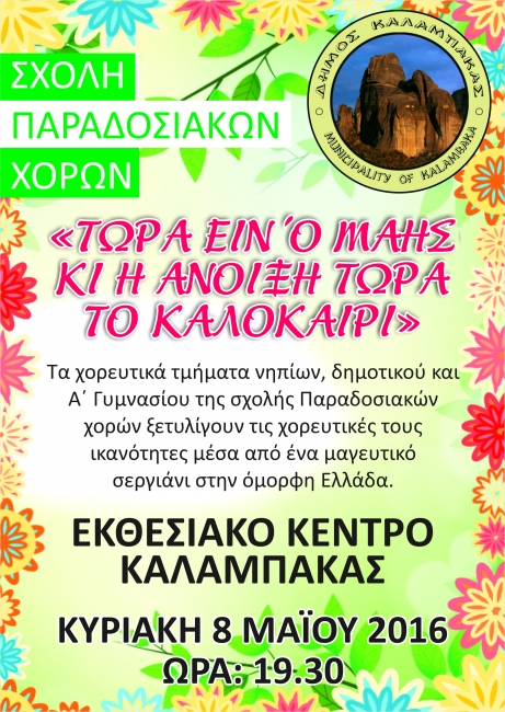 Εκδήλωση με τίτλο “Τώρα ειν’ ο Μάης κι η Άνοιξη, τώρα το καλοκαίρι” θα πραγματοποιηθεί την Κυριακή 8 Μαίου στις 19:30 το απόγευμα στο Πολιτιστικό Κέντρο Καλαμπάκας από την Σχολή Παραδοσιακών Χορών Δ. Καλαμπάκας.