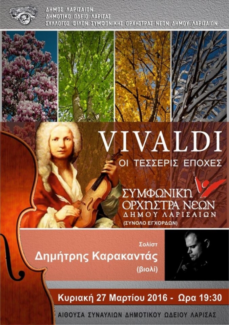 Η Μουσική Σχολή Δήμου Καλαμπάκας διοργανώνει την Κυριακή 27 Μαρτίου 2016 εκδρομή στη Λάρισα για την ακρόαση της συναυλίας με την Ορχήστρα Δωματίου του ΔΩΛ και εξάρχων τον διακεκριμένο διεθνούς φήμης σολίστα Δ. Καρακαντά , του έργου « Τέσσερις Εποχές» του A. Vivaldi.