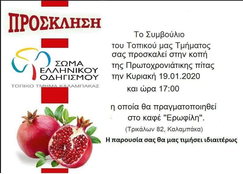 Το Συμβούλιο του Τοπικού μας Τμήματος σας προσκαλεί στην καθιερωμένη κοπή της πρωτοχρονιάτικης πίτας του Οδηγισμού που θα πραγματοποιηθεί την Κυριακή 19.01.2020 και ώρα 17:00 στο καφέ Ερωφίλη .
