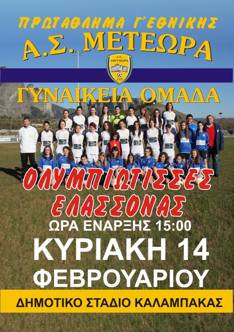Ανοικτό κάλεσμα απευθύνουν στον φίλαθλο κόσμο της ευρύτερης περιφέρειας της Καλαμπάκας, τα κορίτσια της Γυναικείας ομάδας Ποδοσφαίρου των Μετεώρων για την έκτη αγωνιστική (τελευταίος εντός έδρας αγώνα για φέτος), για το Πρωτάθλημα της Γ΄ Εθνικής Γυναικών, την Κυριακή 14-2-2016 και ώρα 15:00, στο Δημοτικό Στάδιο Καλαμπάκας, όπου θα αντιμετωπίσει την αντίστοιχη ομάδα του Α.Σ. Ολυμπιώτισσες – Ελασσόνας.