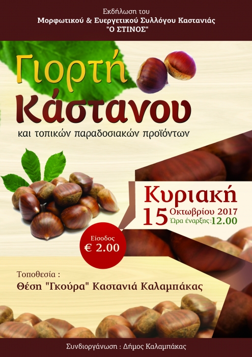 Ο Μορφωτικός & Ευεργετικός Σύλλογος Καστανιάς «Ο ΣΤΙΝΟΣ» υπό τη συμβολή του Δήμου Καλαμπάκας, διοργανώνει την Κυριακή 15 Οκτωβρίου 2017 στη θέση «Γκούρα» στην Καστανιά Καλαμπάκας την 11η Γιορτή Καστάνου & Παραδοσιακών Προϊόντων.