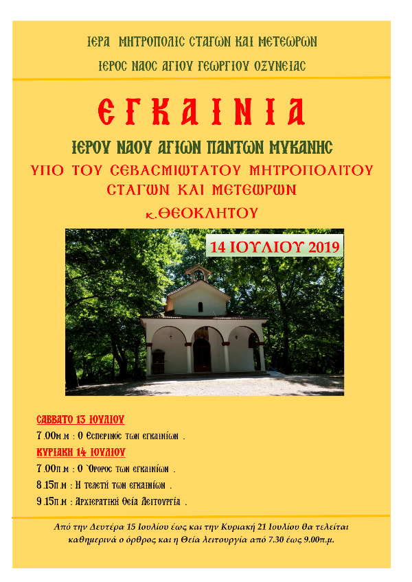 Το Εκκλησιαστικό Συμβούλιο του Ιερού Ναού Αγίου Γεωργίου Οξύνειας, σας προσκαλεί στα Εγκαίνια του παρεκκλησίου των Αγίων Πάντων Μύκανης, που θα τελεσθούν την Κυριακή 14 Ιουλίου 2019 υπό του Σεβασμιωτάτου Μητροπολίτου Σταγών και Μετεώρων κ. Θεοκλήτου.