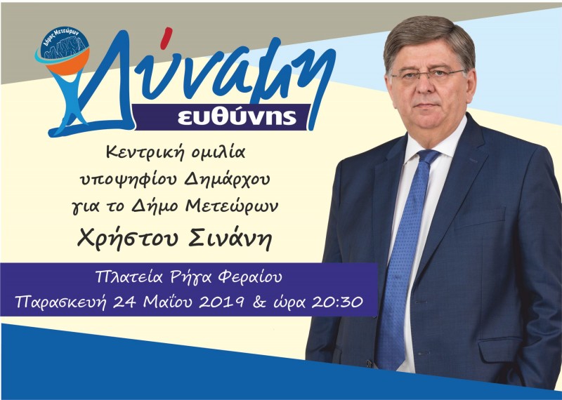 Ο Υποψήφιος Δήμαρχος Δήμου Μετεώρων Χρήστος Σινάνης σας καλεί όλους την Παρασκευή 24 Μαΐου στις 20:30 το βράδυ στην πλατεία Ρήγα Φεραίου Καλαμπάκας στην κεντρική του ομιλία.