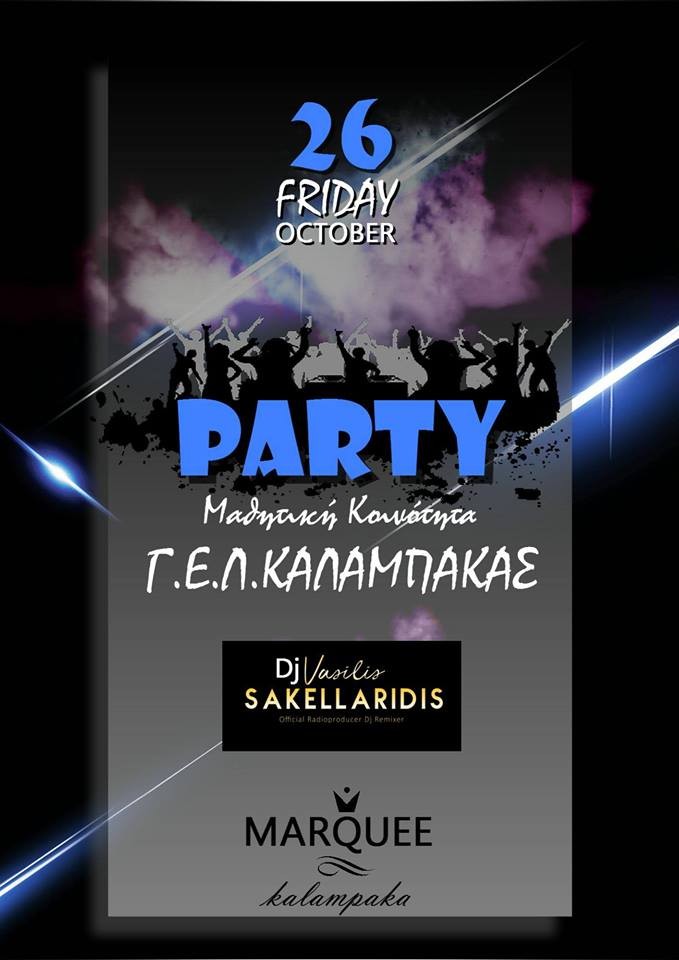 Στο Marquee θα διασκεδάσουν οι μαθητές του Γ.Ε.Λ Καλαμπάκας την Παρασκευή 26 Οκτωβρίου το βράδυ.