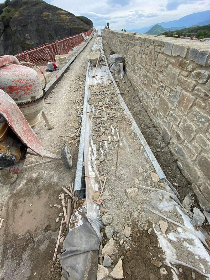 Σε εξέλιξη βρίσκεται η κατασκευή των στηθαίων από λιθοδομή για την προστασία των πεζών, με ενσωμάτωση εντός αυτών της υποδομής φωτισμού της γέφυρας.