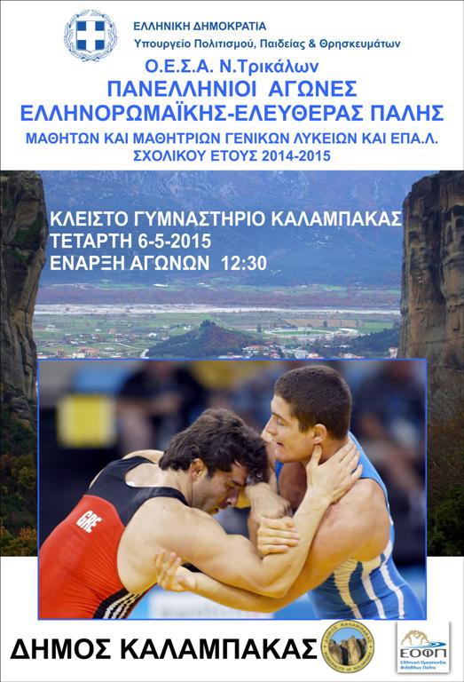 Την Τετάρτη 6 Μαΐου 2015, θα διεξαχθούν στο «Βλαχάβειο» Γυμναστήριο Καλαμπάκας τα Πανελλήνια Πρωταθλήματα Σχολικών Αγώνων μαθητών και μαθητριών Λυκείων ΓΕΛ και ΕΠΑΛ Σχολικού Έτους 2014 -2015, Ελληνορωμαϊκής και Ελευθέρας Πάλης.