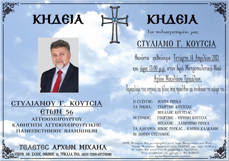 Την Τετάρτη στα Τρίκαλα η κηδεία του Αγγειοχειρουργού Στυλιανού Κούτσια Ανακοινώσεις Από admin Δημοσίευση Απρ 13, 2021 -15:26 0 1.293 Κοινοποίηση FacebookTwitterΗλεκτρονικό ΤαχυδρομείοViber Τον πολυαγαπημένο μας Στυλιανό Γ. Κούτσια θανόντα κηδεύουμε την Τετάρτη 14 Απριλίου 2021 και ώρα 13:00 το μεσημέρι στον Ιερό Μητροπολιτικό Ναό Αγίου Νικολάου Τρικάλων 0 1.293 Κοινοποίηση